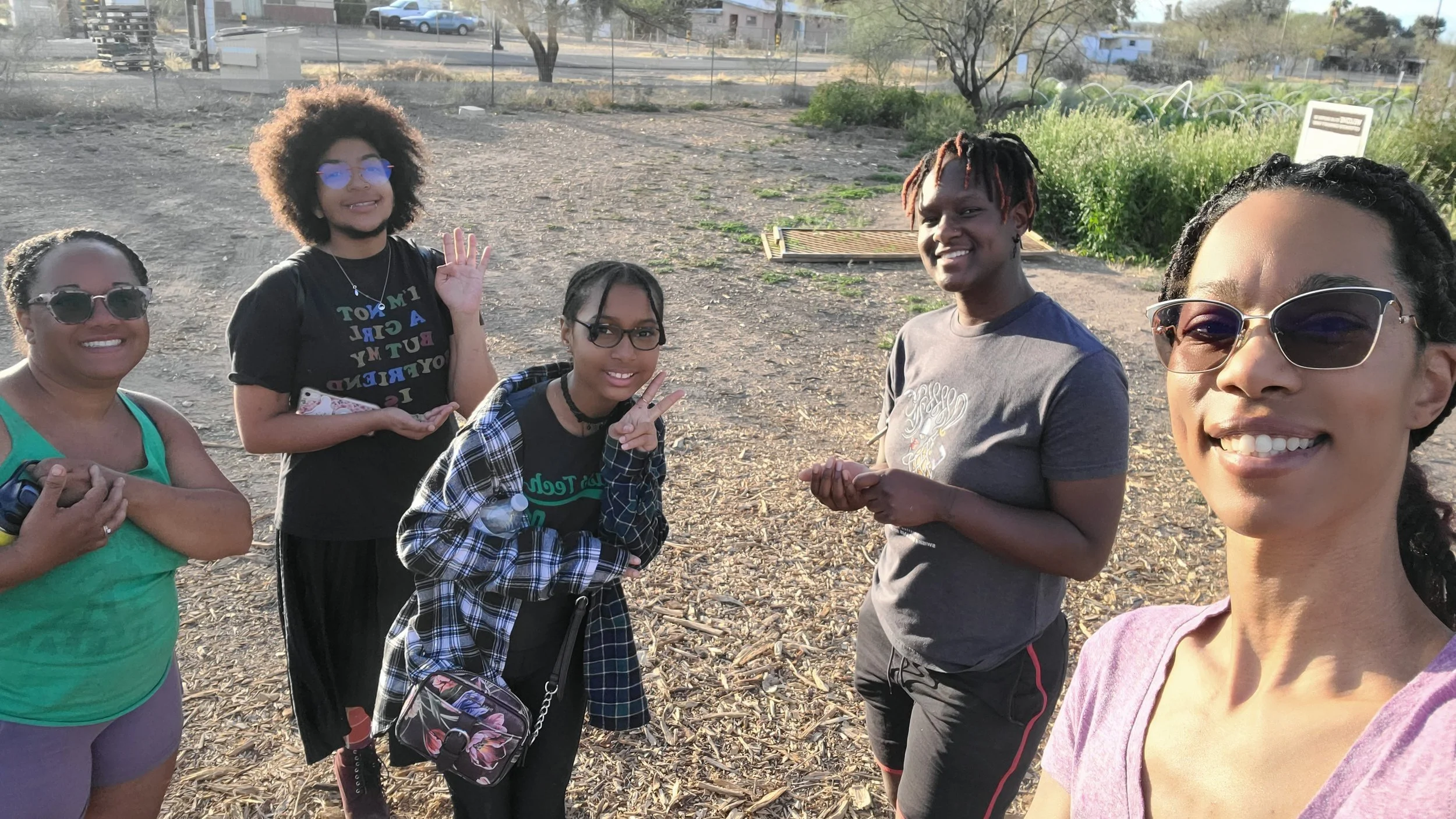 Group of six smiling diverse people outdoors on a sunny day, posing for a selfie with a dirt field and some plants in the background.