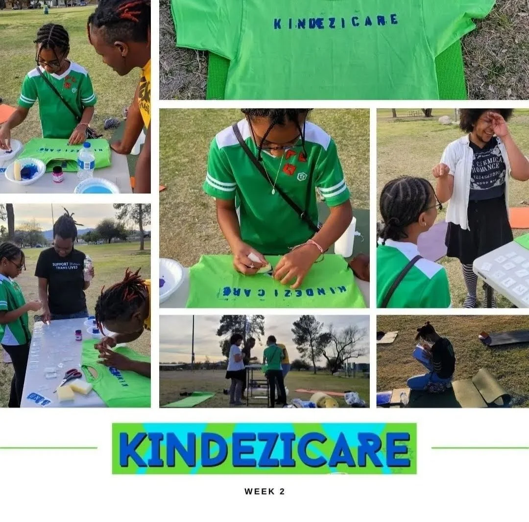 A collage of photos from an outdoor event called KIINDEZICARE, showing children in green shirts participating in craft activities and socializing, with a focus on creating and decorating a green t-shirt with the word 'KIINDEZICARE' written on it.